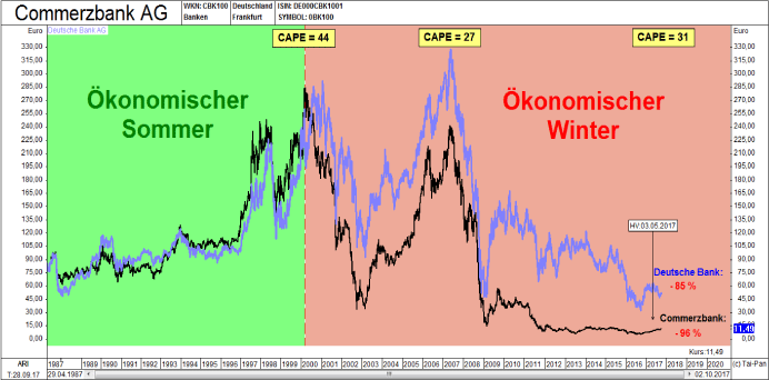 Abb. 2: Deutsche Bank (blau) vs. Commerzbank (schwarz) von 04/1987 bis 09/2017