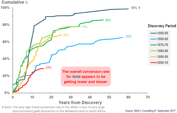 In den 1950er Jahren wurden 99% aller entdeckten Unzen ausgebeutet. Prof. Schodde merkt hierzu in der Fußnote der Graphik an, dass hierfür die großen Entdeckungen im südafrikanischen Witwatersrand verantwortlich sind.