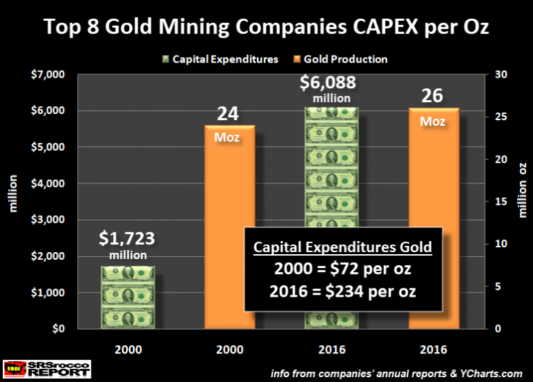 Auch hier können wir sehen, dass die Investitionen im Zeitraum von 2000 bis 2016 von 72 $ je Unze auf 234 $ je Unze gestiegen sind, während die Produktionsleistung insgesamt nur um 2 Mio. Unzen gesteigert werden konnte. Die Investitionskosten der Unternehmen haben sich zwar nur auf das 3,2-fache erhöht, aber auch hier zeigt sich, dass es heute viel teurer ist, die Goldproduktion fortzusetzen und aufrechtzuerhalten.