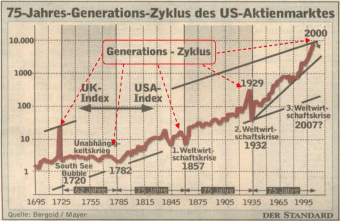Abb. 1: Drei-Generationen-Zyklus anhand des UK-/US-Aktienmarktes von 1695 bis 2000