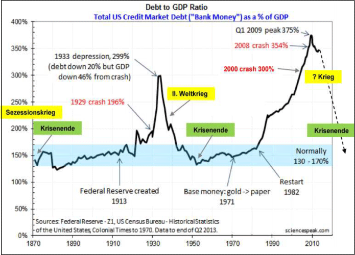 Abb. 2: US-Gesamtverschuldung prozentual zum US-BIP von 1870 bis 2013