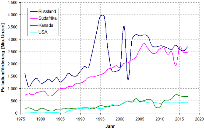 Wie beim Platin (Pt), so stellen Südafrika und Russland auch für Palladium (Pd) die Hauptförderländer dar. Während Pt im Jahr 2016 zu 82,8 % aus diesen beiden Ländern stammte, ist der Prozentsatz bei Pd mit 72,9 % etwas geringer. Mit knapp 7 Mio. Unzen (= 218 t) lag 2016 die Minenförderung bei Pd etwas höher wie bei Pt mit 6 Mio. Unzen (= 187 t).