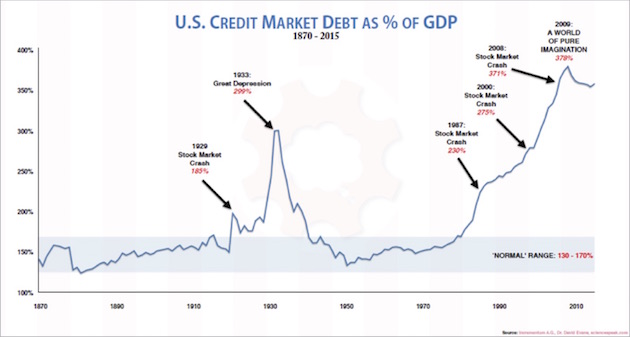 Der Chart ist unkompliziert und direkt. Man sieht die ausstehenden Kreditmengen prozentual zum BIP. Grob gesagt, haben wir hier einen Maßstab, wie stark die US-Wirtschaft kreditfinanziert ist.