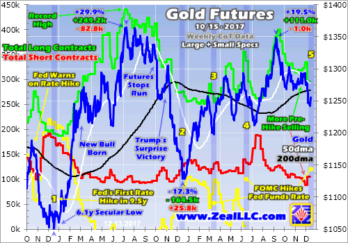 Während der folgenden 8 Handelstage, die in das FOMC-Treffen von 20. September mündeten, auf dem die Fed ihr beispielloses Programm quantitativer Verknappungen (QT) zur Welt brachte, stiegen die Wahrscheinlichkeiten für Zinserhöhungen teils bis auf 62%. Die an jenem Tag erfolgende FOMC-Erklärung als auch Janet Yellens Pressekonferenz ließen die Wahrscheinlichkeit von Dezember-Zinserhöhungen dann noch höher schießen - auf 73%. Also sackte Gold zurück auf 1.300 $, da die Futures-Spekulanten vor Angst zitternd verkauften.