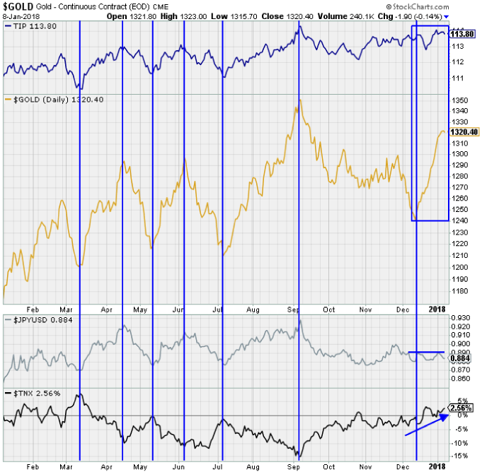 Die Rallye des Goldpreises, beginnend vom 12.12.2017 bis heute, war vergleichsweise stark und womöglich mehr, als nur eine Erholung.Denn betrachten wir uns den Ihnen bekannten Chartvergleich von Gold mit den inflationsgeschützten Anleihen (TIPS), dem japanischen Yen und den Renditen in den USA, dann sehen wir ein Phänomen, das wir schon lange nicht mehr hatten.