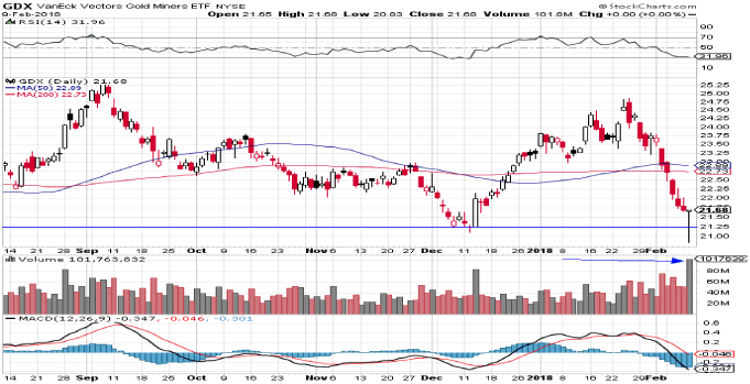 Sie sehen den Tagesverlauf beim GDX, dem liquidesten Goldaktien-ETF in New York.