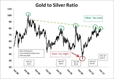 Anfang 1991 erreichte das Gold/Silber-Verhältnis bei 102 sein bisheriges Allzeithoch. Damals verkaufte die US-Regierung das Silber aus ihren Lagerbeständen, die Zentralbanken verkauften ihr Gold und die Kurse beider Edelmetalle hatten sich noch nicht von dem Absturz erholt, der auf die Hochs im Jahr 1980 gefolgt war. Nach dem Finanzcrash im Jahr 2008 stieg das Verhältnis erneut und erreichte ein Maximum von 84. 2016 lag es vorübergehend bei 81 und auch aktuell hat es wieder einen Wert von mehr als 80 angenommen.