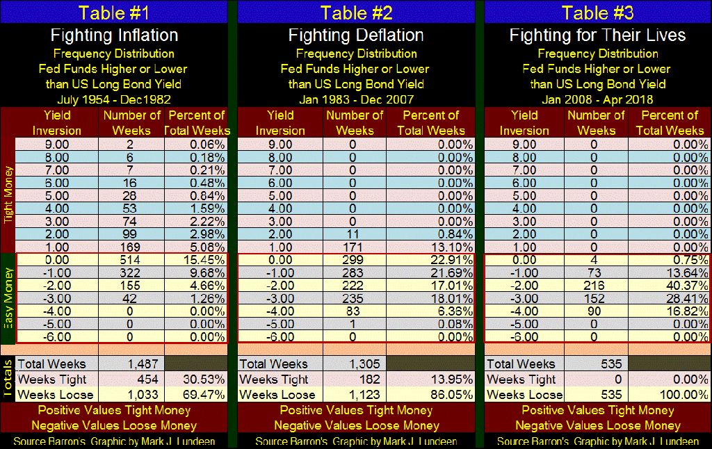 Die unteren Häufigkeitstabellen stellen die drei Epochen dar, die in den obigen Charts gezeigt werden. Sie zeichnen auf, wie viele Prozentpunkte und Wochen der Leitzins der US-Notenbank über oder unter den Renditen der langfristigen Staatsanleihen lag. Wenn die Federal Reserve eine "straffere Geldpolitik" anwendet, ist der Leitzins höher als die Anleihenrenditen und führt somit zu einer Deflationen der Bewertungen irgendwo innerhalb der Wirtschaft; und je höher der Wert, desto straffer das Geld.