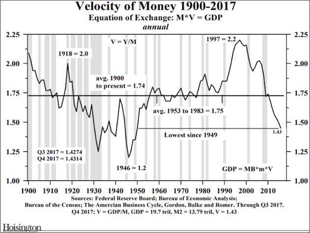 Sie fragen sich nun vielleicht, was genau die Umlaufgeschwindigkeit des Geldes ist. Im Grunde genommen handelt es sich dabei um die Frequenz, mit der ein bestimmter Dollar den Besitzer wechselt, weil dieser das Geld verwendet, um etwas zu kaufen. Eine höhere Umlaufgeschwindigkeit bedeutet mehr wirtschaftliche Aktivität und dies ist normalerweise gleichzusetzen mit einem größeren Wachstum. Es ist also etwas beunruhigend, dass die Umlaufgeschwindigkeit des Geldes heute so niedrig ist wie schon seit dem Jahr 1949 nicht mehr und ein Niveau erreicht hat, das in etwa dem der Großen Depression entspricht.