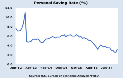 Es könnten sogar 2 Billionen $ oder mehr werden, wenn wir in den nächsten Jahren in eine Rezession gehen. Dies zusammen mit der vorgeblichen Verkürzung der FED-Bilanz bedeutet, daß die USA Käufer für 2 Billionen $ (oder mehr) an Anleihen jährlich finden muß und irgendwann werden alle potentiellen Käufer viel höhere Zinsen für die 10jährigen verlangen und wenn das passiert, werden die Kosten für den Schuldendienst drastisch nach oben springen. Das wird sich mit den immer weiter wachsenden Budgetdefiziten weiter beschleunigen und die Staatsschulden werden steigen, bis etwas kaputtgeht. Es gibt unzählige andere beängstigende Statistiken, die nur dazu dienen werden, die möglichen Auswirkungen der vorher erwähnten Schuldenstände zu erhöhen. Dazu gehört z.B. die persönliche Sparquote, die bei nur 2,40% ein 8-Jahres-Tief erreicht! Letztendlich kommt die echte Schaffung von Arbeitsplätzen aus Investitionen und diese speisen sich aus Ersparnissen.