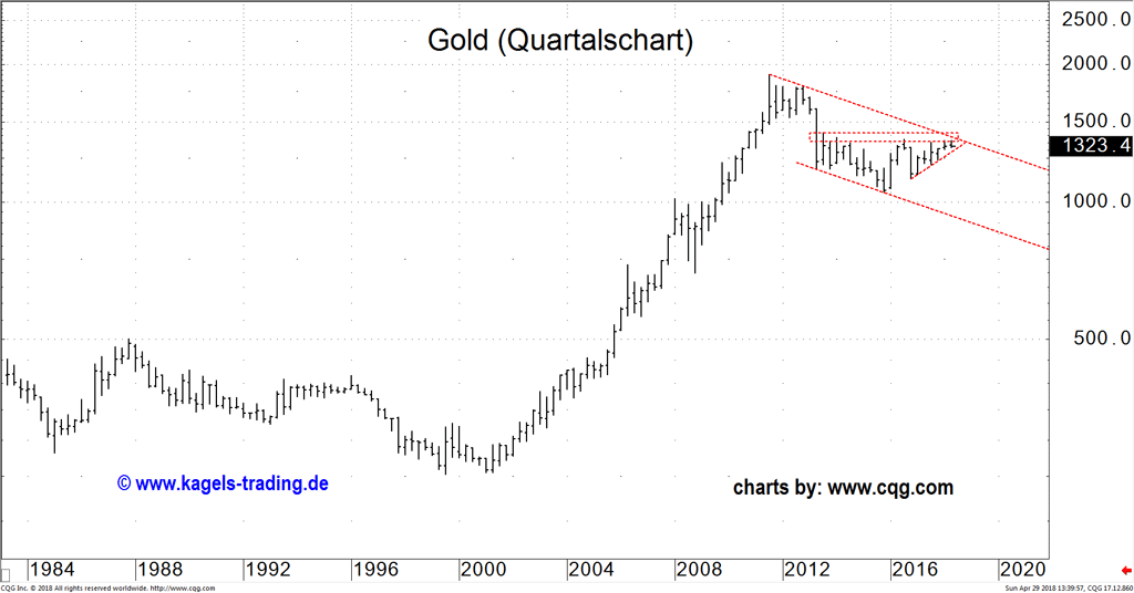 Der abgebildete Chart zeigt die historische Kursentwicklung des Gold Futures von 1981 bis heute, bei Kursen von 1.323,40 USD/Unze. Ein Notierungsstab bildet die Kursschwankungen des Gold Futures für ein Quartal ab.