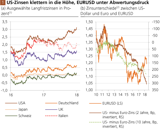 Steigende Zinsen können die konjunkturelle Scheinbesserung im Euroraum zunichtemachen. Deshalb hält die EZB auch so entschieden an ihrer - narkotisierenden - Niedrigzinspolitik fest. Aber auch eine solche Politik ist alles andere als risikolos.Die US-amerikanischen Zinsen klettern in die Höhe - denn die US-Zentralbank (Fed) ist dabei, ihren Leitzins anzuheben. Derzeit befindet er sich in einer Bandbreite von 1,50 - 1,75 Prozent. Die Rendite der 10-jährigen US-Staatsanleihe liegt nun über der 3-Prozentmarke. Im Sog der US-Zinsen haben die Renditen in anderen Währungsräumen angezogen (Abb. 1 a). Von einer geldpolitischen Kehrtwende ist der Euroraum allerdings noch weit entfernt - und dämmert weiter unter der narkotisierenden Geldpolitik der Europäischen Zentralbank (EZB). Der Zinsvorteil des US-Dollar gegenüber dem Euro wächst und setzt den Euro gegenüber dem Greenback unter Abwertungsdruck (Abb. 1 b).