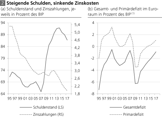 Seit der Krise 2008/2009 ist die Staatsverschuldung im Euroraum von 64,9 Prozent des Bruttoinlandsproduktes (BIP) auf 86,7 Prozent gestiegen - und liegt damit weit über der ursprünglich angedachten "Höchstgrenze" von 60 Prozent des BIP (Abb. 2 a). Gleichzeitig sind die Zinszahlungen von 2,9 auf 1,9 Prozent des BIP gefallen. Der Grund: Die EZB hat die Zinsen drastisch abgesenkt. Dadurch konnten die Staaten ihre fälligen Kredite mit neuen Krediten, die mit sehr niedrigen Zinsen ausgestattet sind, refinanzieren. Zudem war es den Staaten möglich, neue Kredite zu sehr niedrigen Zinsen aufzunehmen.