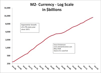 Die St. Louis Federal Reserve veröffentlichte Daten zur Geldmenge M2, einem Maßstab der sich in Umlauf befindenden Währung. Die Zahlen der letzten 50 Jahre zeigen, dass M2 exponentiell zu etwa jährlichen 6,7% seit 1971 gewachsen ist (gerade Linie in einem logarithmischen Graphen). Die Wirtschaft ist viel langsamer gewachsen.