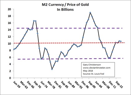 Auch wenn die Goldpreise schwanken, steigt der Preis des gelben Metalls zeitgleich mit der Geldmenge. Der untere Graph zeigt M2 (in Milliarden Dollar) geteilt durch den Goldpreis.