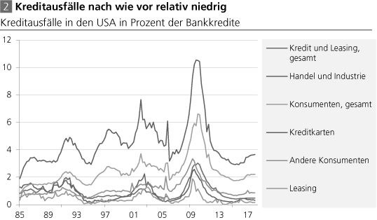 Es kommt zu Kreditausfällen. Wenn sich daraufhin das Kreditangebot verknappt, wird die Konjunktur abgebremst. Noch aber sind die Ausfälle bei US-Bankkrediten recht gering (Abb. 2) - wenngleich sie den zyklischen Tiefpunkt hinter sich gelassen haben und insgesamt leicht angestiegen sind.