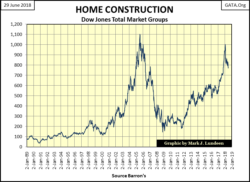 Während der Immobilienblase von 2001 bis 2007 war der Hausbausektor ein äußerst dynamisches Marktsegment. Das Hoch, welches der Index bereits Mitte 2005 überschritt - mehr als ein Jahr, bevor sich die Probleme am Hypothekenmarkt abzeichneten - hätte damals eine frühzeitige Warnung für alle Marktbeobachter sein können. Nachdem die "Entscheidungsträger der Geldpolitik" nun erneut eine gigantische Blase am Immobilien- und Hypothekenmarkt aufgepumpt haben, könnte der Rückgang, den die Hausbaubranche seit Januar 2018 verzeichnet, auch heute wieder ein frühes Warnsignal sein.