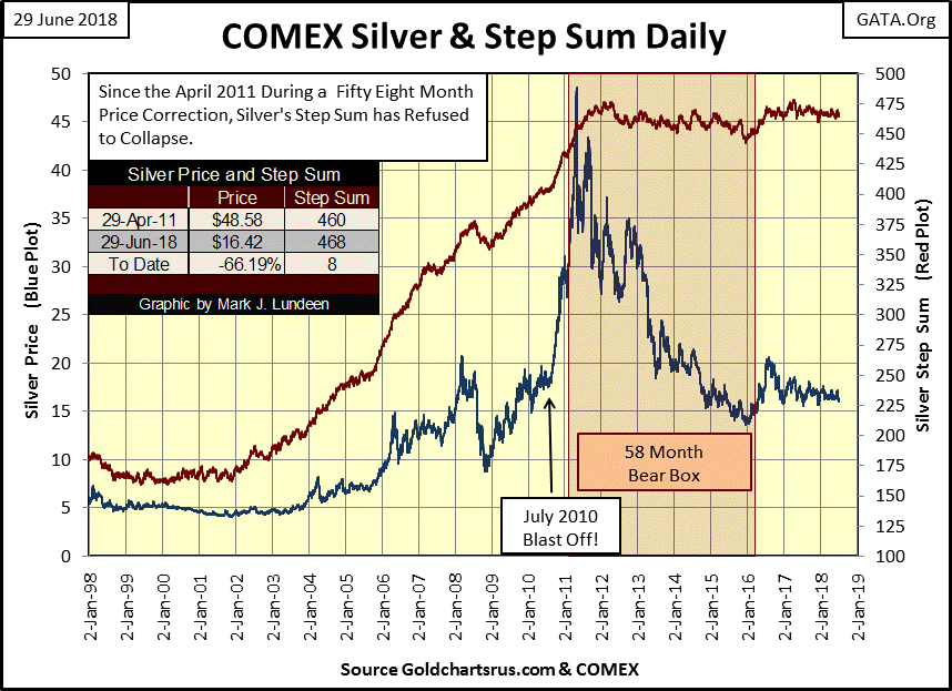 Werfen Sie einen Blick auf die Tabelle im Chart: Seit dem 29. April 2011 ist der Silberkurs 66,19% gesunken, während die Zahl der Tage mit Kursverlusten und -gewinnen insgesamt sehr ausgeglichen war. Es überwiegen sogar die Tage, an denen der Silberpreis im Plus schloss. Im gleichen Zeitraum hat Gold 33,73% nachgegeben, während unterm Strich eine Nettozahl von 29 Tagen mit Kursverlusten verbucht wurde.Was nützt uns dieser Chart also überhaupt? Nun, wenn sich der Silberpreis in einem bedeutenden Aufwärtstrend befindet, dann steigt auch die Stufensumme. Aber da das im Moment nicht geschieht, versuche ich, meine Begeisterung für die monetären Metalle im Zaum zu halten. Sobald die Stufensumme in diesem Chart auf mehr als 500 klettert, sollte es Sie allerdings nichts überraschen, wenn der neue Bullenmarkt der Edelmetalle die Schlagzeilen der Finanzmedien beherrscht.