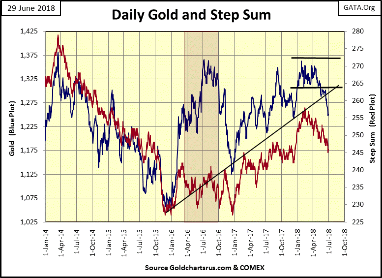 Unten sehen Sie die Stufensumme des Dow Jones. Ebenso wie Gold steht auch dieser Markt unter Verkaufsdruck: