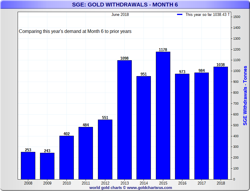 In den zum Juni 2018 endenden 6 Monaten wurden insgesamt 1.038,4 Tonnen physisches Gold über die Shanghai Gold Exchange nachgefragt. Diese Abflüsse repräsentieren Gold, das tatsächlich physisch aus den über ganz China verteilten Lagerhallen der SGE genommen wurde. Die monatlichen Goldabhebungen an der SGE von Januar bis Juni 2018 betrugen: