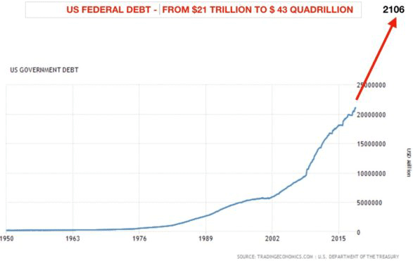 Doch auch der Staat wird seinen Teil dazu beitragen. Er wird dafür sorgen, dass sich die Staatsverschuldung mindestens alle 8 Jahre verdoppelt, so wie er es nun schon seit vielen Jahrzehnten tut (siehe Artikel von letzter Woche). Ausgehend von einer Verschuldungssumme von 21 Billionen $ heute und unter der Annahme, dass jeder Schuldner ein Lebensalter von 88 Jahren erreicht, würde eine Verdoppelung der Schulden alle 8 Jahre dafür sorgen, dass die Gesamtverschuldung im Jahr 2106 ganze 43 Billiarden Dollar erreicht haben wird.
