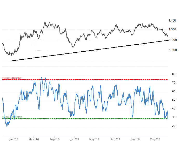Im unteren Teil meines Goldcharts zeige ich Ihnen den Optix-Sentimentindikator. Dieser setzt sich aus mehreren Komponenten zusammen, auf die ich hier nicht näher eingehen kann. Wie Sie sehen, ist dieser Indikator während der jüngsten Korrektur des Goldpreises auf untere Extremwerte gefallen.