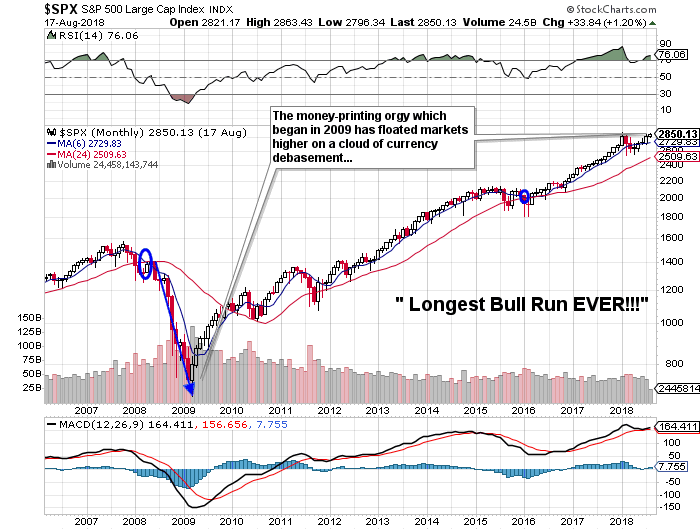 Das neue Rekordhoch, welches der Aktienindex S&P 500 (und Myriaden kleinerer Indices) am Dienstag verzeichnete, markierte den längsten Bullenmarkt in der Geschichte der New Yorker Börse. Da sich diese Hausse vor dem Hintergrund einer gigantischen globalen Kreditschwemme abspielte, möchte ich Ihnen heute eine Liste gescheiterter Trades und Investments präsentieren, die zahlreichen gewieften (und nicht so gewieften) Anlegern 2018 einiges Kopfzerbrechen verursachten.Gescheiterter Trade Nr. 1: Aktien shorten während einer Orgie des Gelddruckens