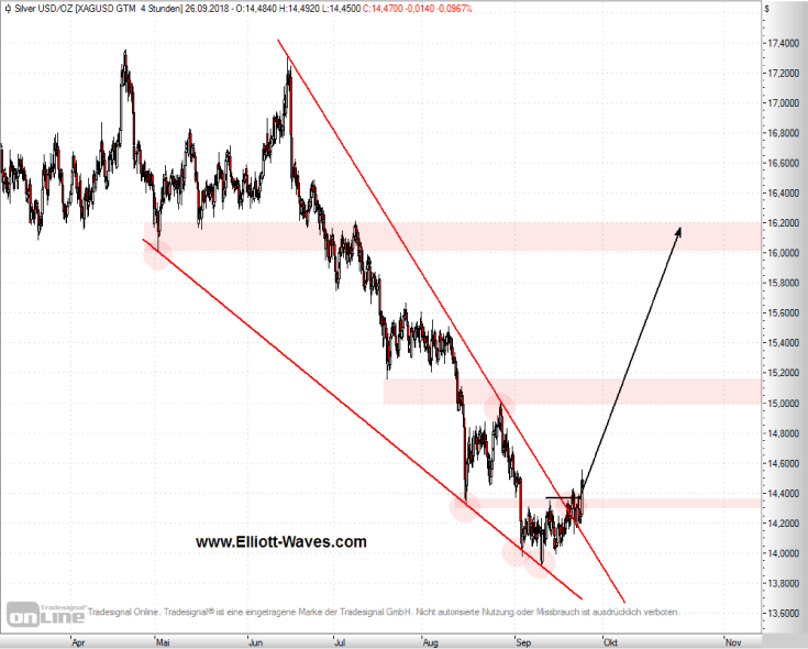 Auch aus dem kurzfristigen Chartbild lässt sich jetzt eine konkrete Aufwärtsbewegung ableiten. Silber ist gestern über einen wichtigen charttechnischen Widerstand gestiegen: Sowohl der Abwärtstrend seit Juni als auch der horizontale Widerstand (14,30/14,35 USD) wurden gestern nach oben durchstoßen. Zusätzlich lässt sich die Abwärtsbewegung seit dem April-Hoch als fallender Keil beschreiben, was den Ausbruch zusätzlich in einem bullischen Licht erstrahlen lässt.