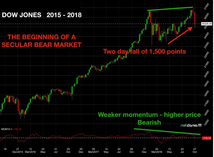 Und so geschah es. Innerhalb von zwei Tagen fiel der Dow um 1540 Punkte, um an Ende dieser beiden Verlusttage mit 1.100 Punkten im Minus zu schließen. Nach Erreichen des Dezember/ Januar-Hochs hatte der Dow 10 Monate gebraucht, um ein neues Hoch zu markieren. Aber das war‘s dann auch!