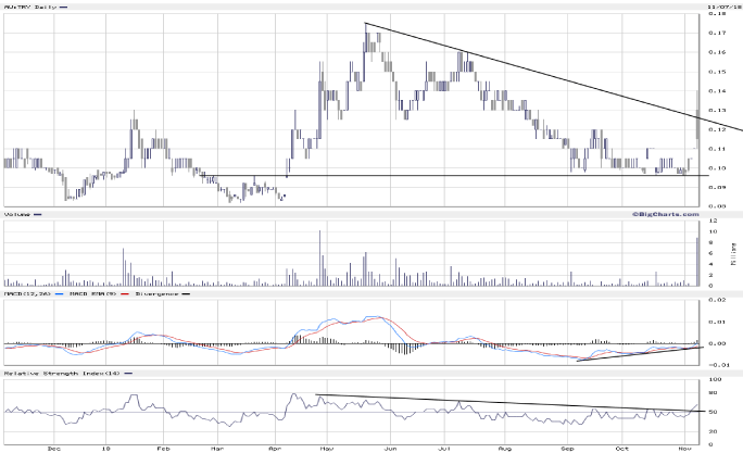 Die Aktie ging im Tageshoch auf 0,14 AUD (+40%), doch am Ende bei 0,115 AUD (+16%) aus dem Handel. Ich denke, dass das zu wenig ist und die Aktie eigentlich in deutlich höhere Gefilde gehört.
