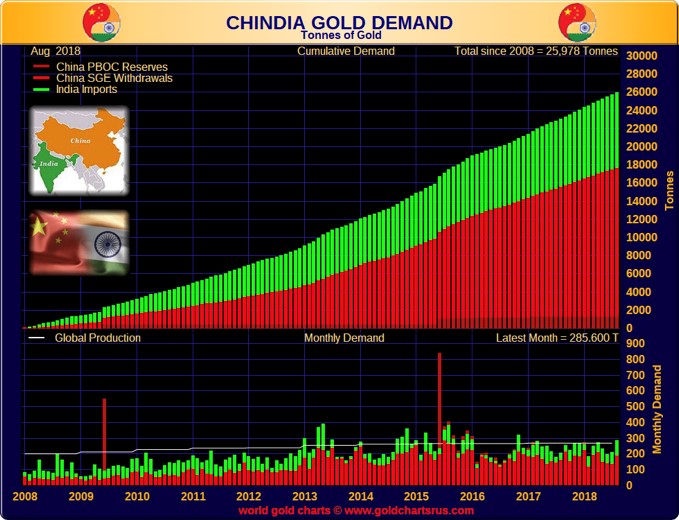 Wo das ganze Gold hingeht, ist eigentlich überhaupt kein Geheimnis. Während der Westen keine Ahnung von der strategischen Bedeutung des physischen Goldes hat, schreitet der Osten mit der Akkumulation des gelben Metalls unablässig voran.Seit 2008 haben allein China und Indien 26.000 Tonnen Gold akkumuliert. Das ist eine bemerkenswerte Zahl, die praktisch der gesamten globalen Bergbauproduktion in diesem Zeitraum entspricht. Es gibt auch andere östliche Länder, die ebenfalls nach wie vor große Mengen Gold ankaufen, wie Russland, die Türkei, der Iran und Thailand.