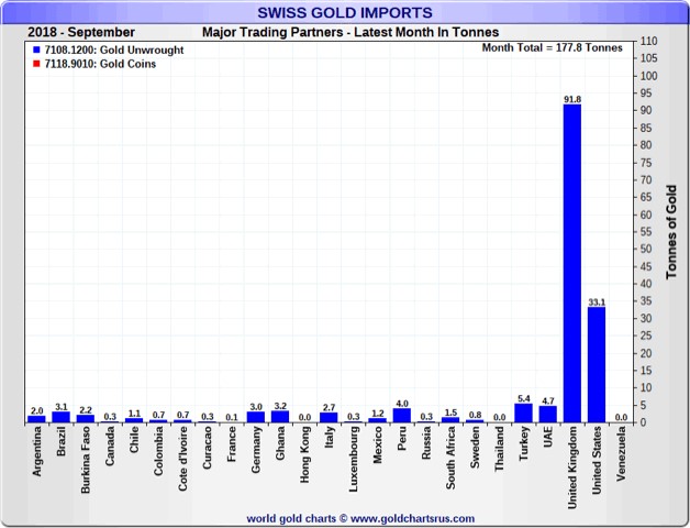 Beim Großteil jener 33 Tonnen, die im September aus den USA kamen, handelt es sich ebenfalls um 400-oz-Barren, die von US-Bullion-Banken stammten. Der größte Teil des aus Großbritannien und den USA kommenden Goldes, stammt wahrscheinlich aus den Zentralbanken.