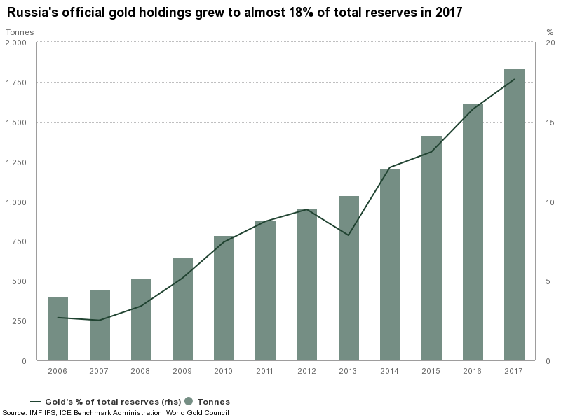 Die offiziellen Goldbestände des Russischen Föderation haben sich bis 2017 auf fast 18% der Gesamtreserven erhöht