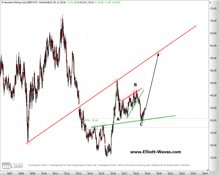 Die Wahrscheinlichkeit, dass die gesamte ABC-Korrektur der letzten fast 2 ½ Jahren beendet ist, ist damit sprunghaft gestiegen. Sofern das Jahrestief bei 29,06 USD nicht mehr unterschritten wird, hat Newmont ein Kurspotenzial, das die Hochs aus 2016 deutlich übertreffen kann. Neben ca. 46 USD, können sich Aktionäre für das kommende Jahr auch die Marke von 55 bis 57 USD merken!