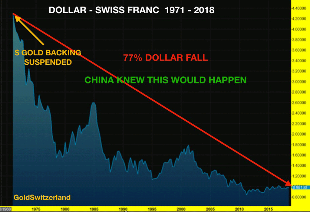 Die Aussage oben ist natürlich absolut zutreffend für ein Land, das seit über einem halben Jahrhundert Haushalts- und Handelsdefizite einfährt und insgesamt, einschließlich ungedeckter Verbindlichkeiten, mit hunderten Billionen Dollar verschuldet ist.Die Aussage könnte von heute stammen, doch sie wurde schon im August 1971 getroffen, als die Chinesische Volkszeitung den Anfang des Endes des Geldsystems der kapitalistischen Welt ausrief.