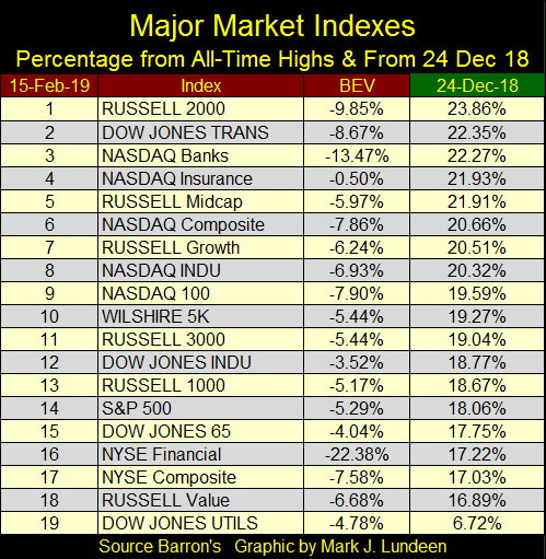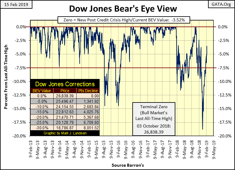 Der Dow Jones Index stürmt in seinem Bear's Eye View (BEV) Chart den Hügel hinauf und behält dabei stets ein mögliches neues Hoch im Visier. In der letzten Woche ist er um 2,9% vorgedrungen, wodurch ihm nur noch 3,52% bleiben, bevor er wieder Aktienmarktgeschichte schreibt. Noch einige solcher Wochen mehr und der Dow Jones wird sich wieder im Rekordhöhenbereich befinden.Das ist ein sehr starker Vorstoß, aber etwas stimmt mit ihm nicht. Dieser Vorstoß folgt auf den Korrekturboden bei -18,77% am 24. Dezember 2018, der tiefsten Korrektur seit dem Boden im Bärenmarkt am 9. März 2009. Vergleichen Sie es mit den anderen Korrekturen bei -7,5% (Rückgänge unter die rote Linie) unten. Auch sie stiegen zu neuen 0%-Linien im BEV-Chart, aber anders als beim aktuellen Vorstoß, hatten sie signifikante Korrekturen, bevor sie dort ankamen.