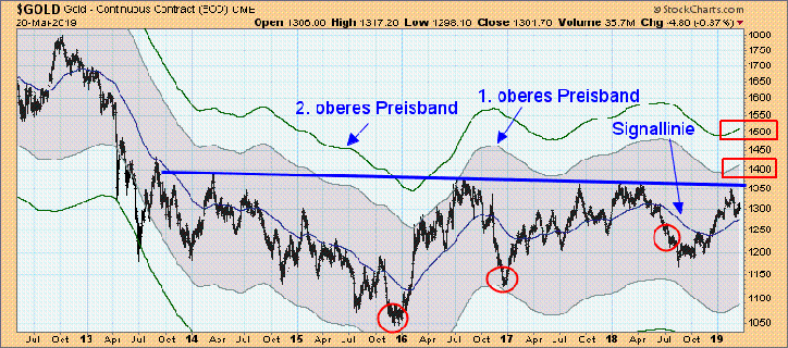 Goldpreis pro Unze in in US-Dollar, Preisbänder-Indikator, 2012 bis 2019