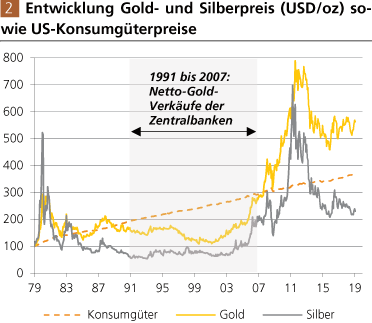 Langfristig betrachtet ist der Goldpreis allerdings stärker gestiegen als die Inflation der US-Konsumgüterpreise (Abb. 2). Das Gold war also so gesehen ein Inflationsschutz. Das lässt sich für das Silber im Betrachtungszeitraum nicht sagen. Allerdings ist zu berücksichtigen, dass in der Zeit von Anfang 1991 bis etwa Ende 2007 die Zentralbanken weltweit Netto-Goldverkäufer waren.