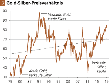 Es hat zwar mitunter recht stark geschwankt, aber der unterliegende Verlauf der Linie war aufwärtsgerichtet. Das heißt nichts anderes, als dass der Goldpreis im Zeitablauf stärker gestiegen ist als der Silberpreis. In der Zeit von Februar 1979 bis März 2019 ist der Goldpreis um 462,8 Prozent gestiegen, der Silberpreis um 130 Prozent. Auf das Jahr umgerechnet betrug der Goldpreisanstieg durchschnittlich 4,3 Prozent, der Silberpreisanstieg 2,1 Prozent. Langfristig betrachtet war also das Halten von Gold vorteilhafter als das Halten von Silber.