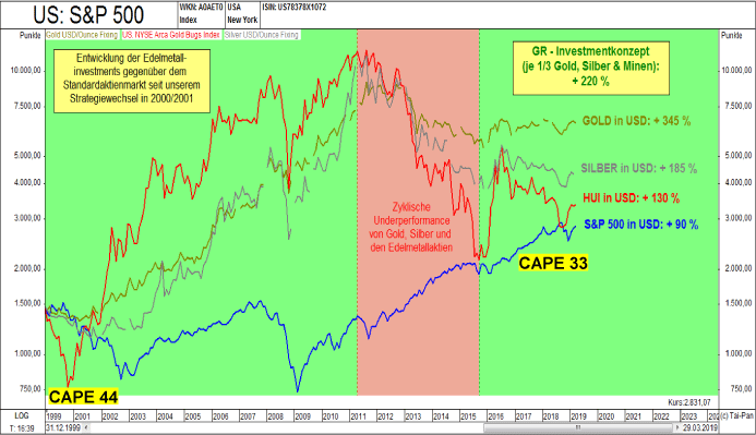 Abb. 3: Gold (gelb), Silber (grau) und Goldaktien (rot) in USD vs. S&P 500 (blau) von 12/99 bis 03/19