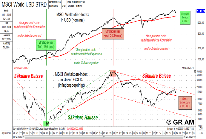 MSCI Weltaktien-Index in USD (oben) vs. MSCI Weltaktien-Index in GOLD (unten) von 12/69 - 03/19