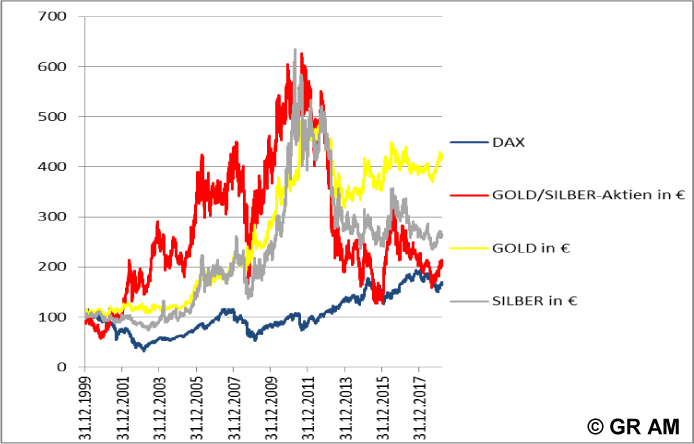 DAX (blau) vs. GOLD (gelb), SILBER (grau) und GOLDAKTIEN (rot) von 01/2000 bis 03/2019