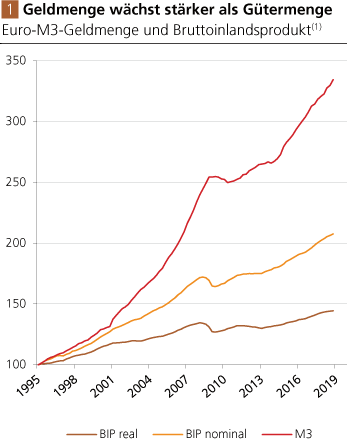 Das ungedeckte Papiergeld, hier am Beispiel des Euro, ist kein verlässliches Wertaufbewahrungsmittel. Es verliert seine Kaufkraft im Zeitablauf, und zwar stärker, als viele meinen.Beginnen wir mit einer Beobachtung: Im heutigen ungedeckten Papiergeldsystem wächst die Geldmenge chronisch schneller als die Güterproduktion; das lässt sich in allen Währungsräumen, in denen ungedecktes Papiergeld verwendet wird, beobachten. Abb. 1 zeigt die Verhältnisse für den Euroraum. In der Zeit 1996 bis Ende 2018 ist das reale Bruttoinlandsprodukt (BIP) im Durchschnitt um 1,5 Prozent pro Jahr gewachsen. Das nominale Bruttoinlandsprodukt - das heißt das reale Bruttoinlandsprodukt bewertet zu laufenden Preisen - ist durchschnittlich um 3,1 Prozent pro Jahr gestiegen. Die Euro-Geldmenge ist am stärksten gewachsen: um 5,2 pro Jahr im Durchschnitt der Betrachtungsperiode.