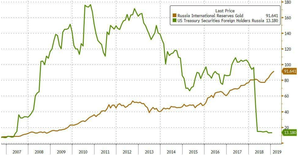 China und Russland gehen daher einen anderen Weg und bevorzugen lieber Gold. Russland hatte allein im vergangenen Jahr seine Goldreserven um 274 Tonnen aufgestockt und weltweit sollen es 651,5 Tonnen gewesen sein, die die Zentralbanken im letzten Jahr erworben hatten. Nach Bloomberg hat China wieder mit Goldkäufen begonnen, nachdem es in den letzten zwanzig Jahren seine Reserven mehr als vervierfacht hatte.