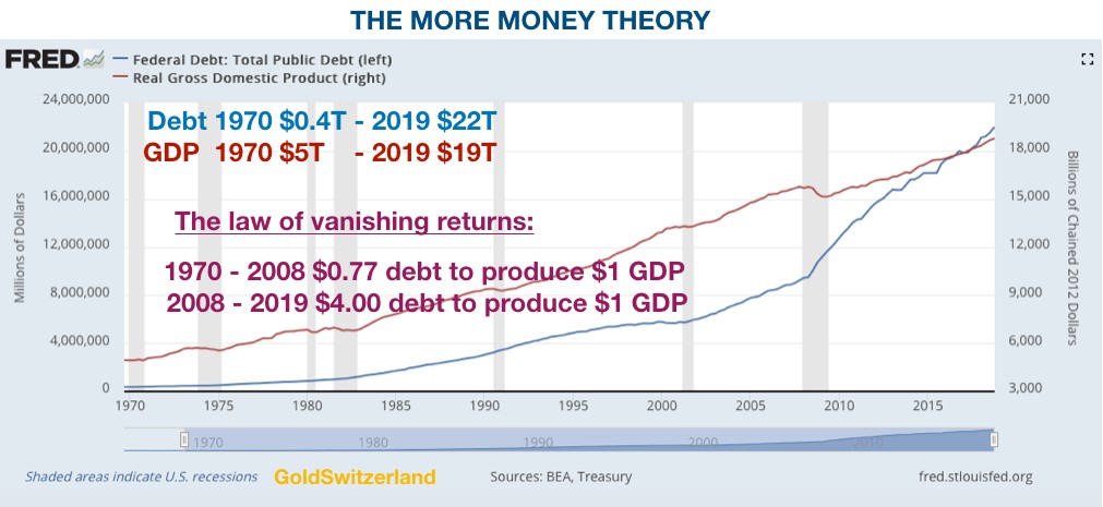 Im Gegensatz zu Italien können die USA ihr eigenes Geld drucken. Und das machen sie auch in immer größerem Umfang. Man braucht sich nur den Chart unten anschauen. Er zeigt, dass die USA nur einen Weg kennen, um BIP-Wachstum zu erzeugen. Man darf aber nicht vergessen, dass unbegrenzte Schöpfung wertlosen Geldes zu einer Totalentwertung der Währung führt, was nur eine andere Form der Zahlungsunfähigkeit ist.