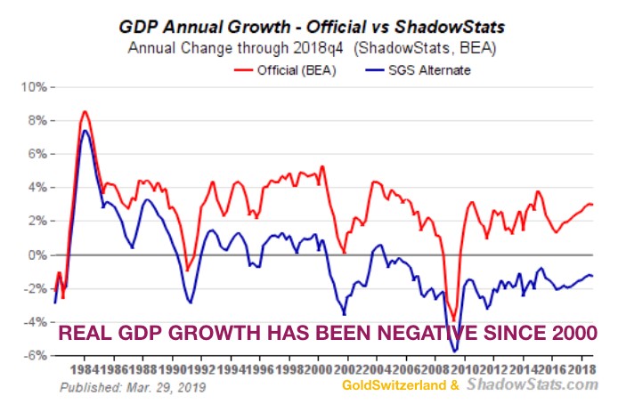 Schauen wir uns das BIP-Wachstum auf Grundlage der realen Inflation (ShadowStats) an. Das reale BIP-Wachstum liegt seit 1990 bei weniger als 2% jährlich. Seit 2000 ist das reale BIP-Wachstum in den USA negativ gewesen. Die Gründe dafür liegen auf der Hand. Die USA haben 4 $ gedruckt, um einen Anstieg des nominalen BIP in Höhe von 1 $ zu erreichen.