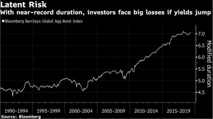 Wie Bloomberg am 12. April berichtete, hat sich das Volumen von Investment-Grade Bonds seit der Finanzkrise auf 52 Billionen Dollar verdoppelt. Die Renditen sind durchschnittlich auf 1,8% gesunken, die Hälfte des Levels in 2007. Die so genannte „Duration“ notiert mit aktuell 7 nahe Rekordhoch. Die Duration (Bonds mit niedrigen Renditen und langer Laufzeit tendieren zur höchsten Duration) misst, wie sich der Preis des Bonds im Verhältnis zur Veränderung der Rendite verhält.