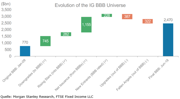 Die US-Investmentbank Morgan Stanley stellte in einer Studie aus dem Oktober 2018 fest, dass sich das Universum der BBB-gerateten Unternehmensanleihen seit dem Jahr 2008 von 770 Mrd. auf 2,4 Bio. US-Dollar ausgeweitet hat.