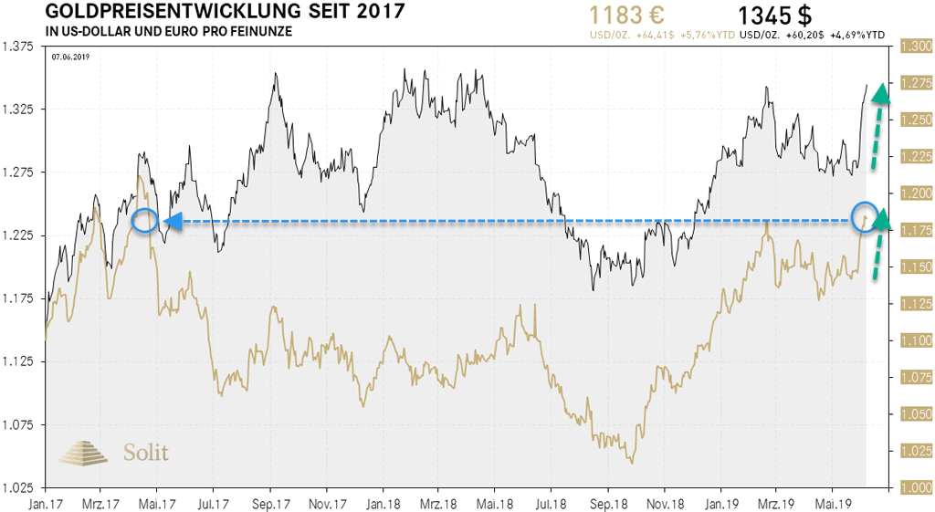 Der Goldpreis stieg in der vergangenen Handelswoche um über 40 $ auf 1.348 $ an und das Plus der letzten zwei Wochen beträgt beachtliche 70 $ je Feinunze. In Euro gerechnet erreichte der Goldpreis mit 1.192 € ein Zweijahreshoch. Nach dem historisch starken Einbruch der Aktienmärkte im Dezember beendete die US-Notenbank im Januar ihre restriktive Geldpolitik und stellte stattdessen Lockerungen in Aussicht. Dies war das Signal für Investoren in inflationsgeschützte Assetklassen zu wechseln, wobei ich im Live-Online-Seminar vom Februar dies als Startschuss für eine neue Goldhausse bezeichnete. Seither baute sich allmählich Druck am Goldmarkt auf. Es gab viele Katalysatoren für die Rallye der letzten beiden Wochen, doch nahm sie mit der Ankündigung von US-Strafzöllen gegen Mexiko ihren Anfang.