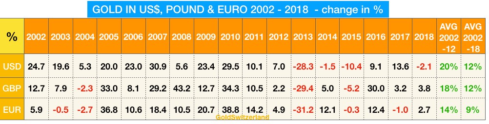 Wenn wir uns den Gesamtzeitraum von 2002-2018 anschauen, so hat Gold in Dollar und Pfund (der großen Korrektur zum Trotz) einen sehr respektablen Jahresdurchschnittsgewinn von 12% erzielt und somit den Dow Jones als auch alle globalen Aktienmärkte hinter sich gelassen.